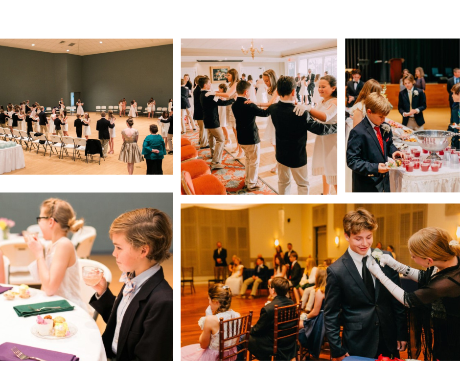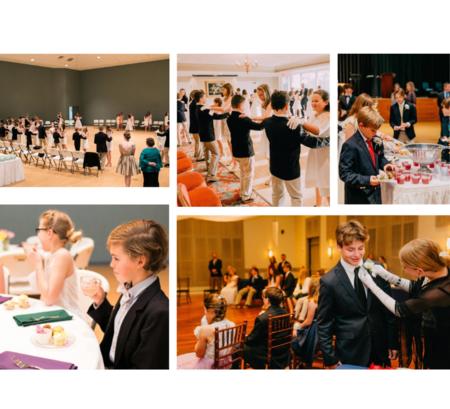 The Celebration Ball: The girls attend the semi-formal in dresses or skirts and white gloves. The boys wear coats and ties. Parents join the fun at the finale event.
